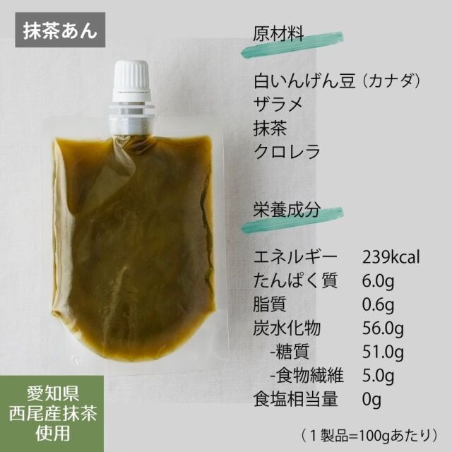 | 原材料 | 白いんげん豆(カナダ)、ザラメ、抹茶、クロレラ |